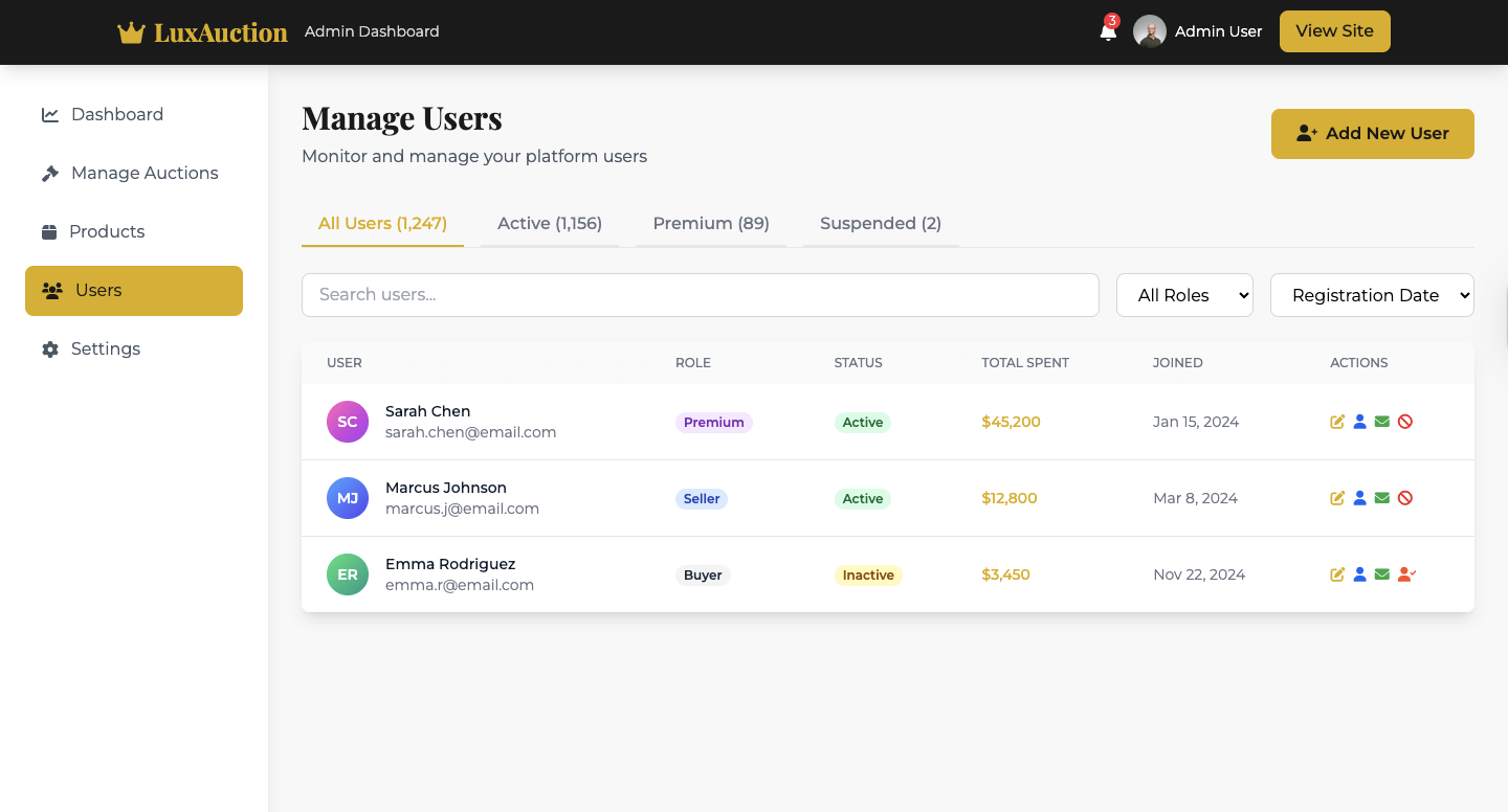 - Seller/Buyer UX: seller CRM for reserves, consignment fees, and payouts; buyer watch-lists, auto-bid rules, and mobile push to sustain engagement across live sales.
